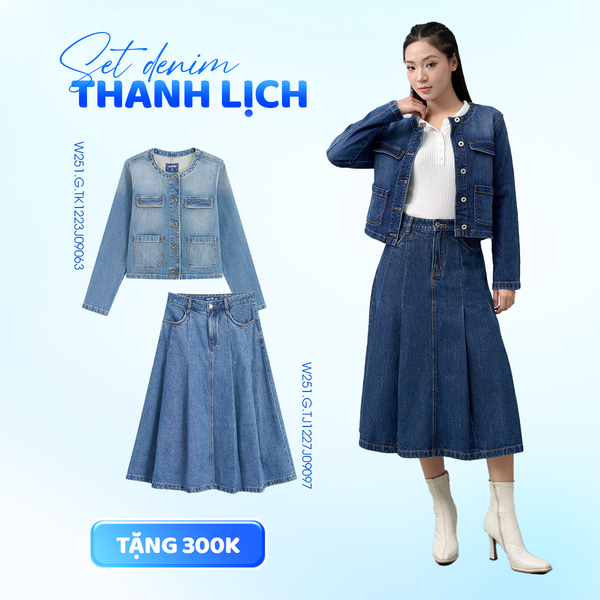 Cá tính và cuốn hút là combo denim-on-denim là lựa chọn lý tưởng cho những ai yêu sự phóng khoáng. Chiếc chân váy juyp xếp ly tôn dáng kết hợp boots trắng giúp outfit thêm phần hiện đại, thể hiện rõ tinh thần “denim chic” đặc trưng của GENVIET JEANS. Set bộ này cũng nằm trong BST “Bản thể Denim” của GENVIET JEANS ra mắt trong tháng này