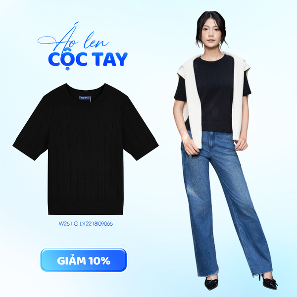 Một gợi ý tối giản nhưng cực kỳ “ăn điểm” – áo len nữ cộc tay ôm dáng phối cùng jeans xanh và khoác len trắng nhẹ trên vai. Cách phối này mang lại vẻ năng động, tự tin mà vẫn giữ được nét nữ tính mềm mại.