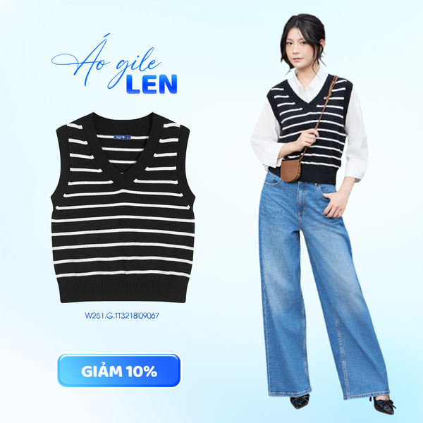 Công thức “chuẩn chỉnh” cho cô nàng công sở năng động: sơ mi trắng kết hợp áo gile len kẻ đen – trắng tạo điểm nhấn tinh tế, cùng quần jeans ống suông giúp tổng thể vừa thanh lịch vừa thoải mái. Set đồ này dễ dàng ứng dụng từ đi làm đến dạo phố, vừa trẻ trung vừa thời thượng.