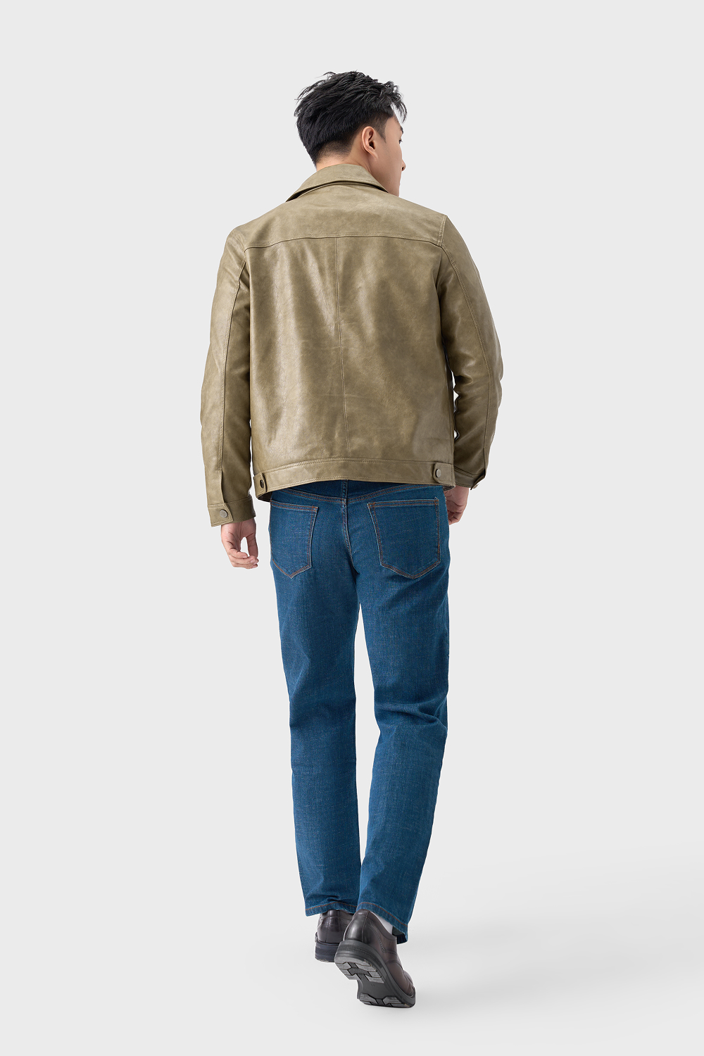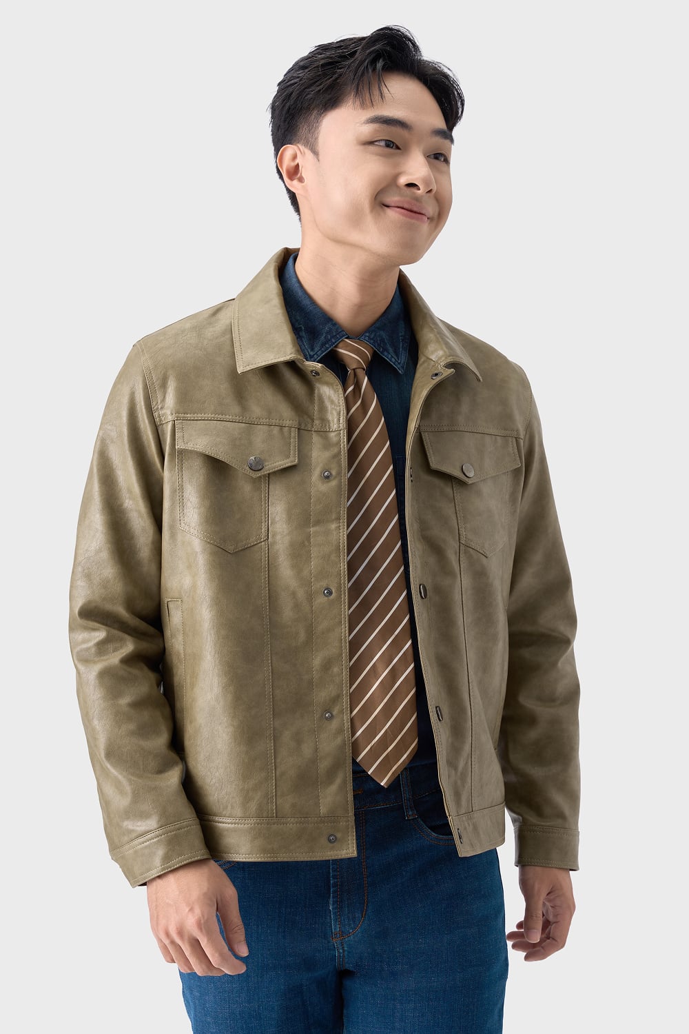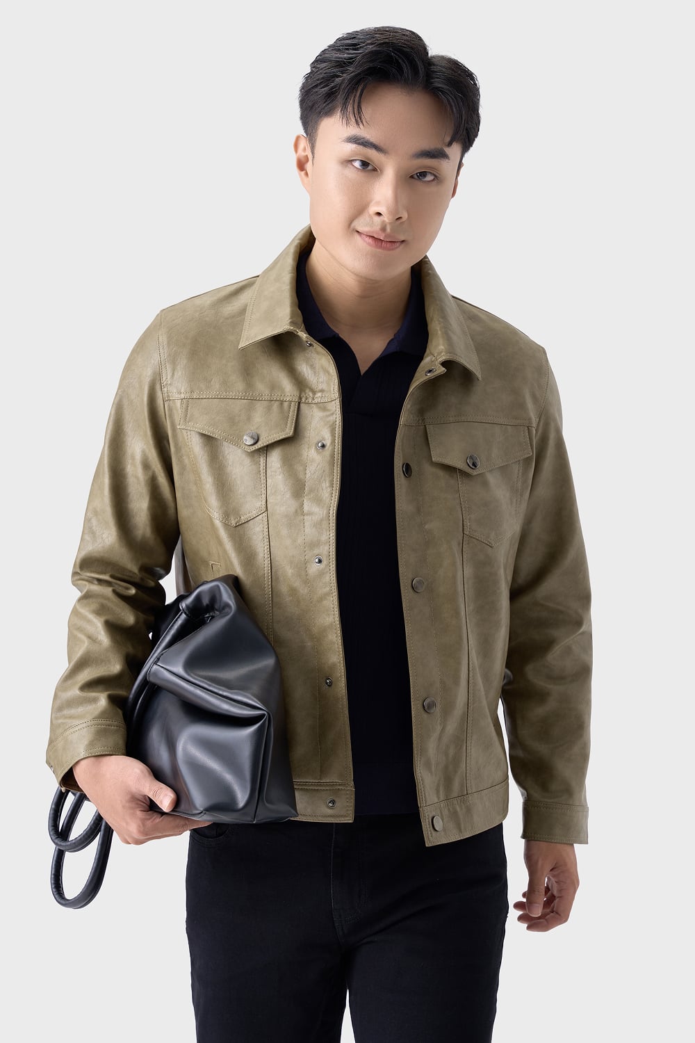 Áo da kết hợp quần chinos + sơ mi hoặc áo len mỏng cổ lọ → phù hợp đi làm, gặp gỡ.