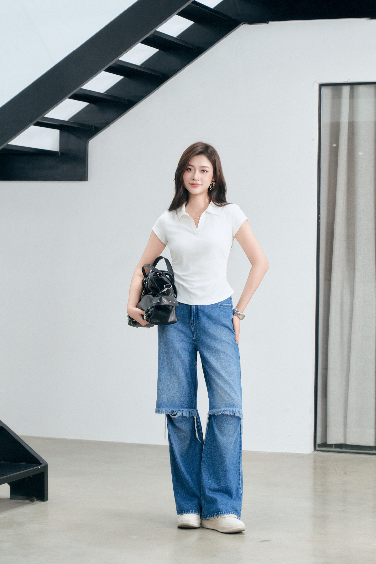 Phối cùng quần jeans suông hoặc jeans vảy, quần short và giày sneaker → năng động, hiện đại, phù hợp đi chơi và dạo phố.