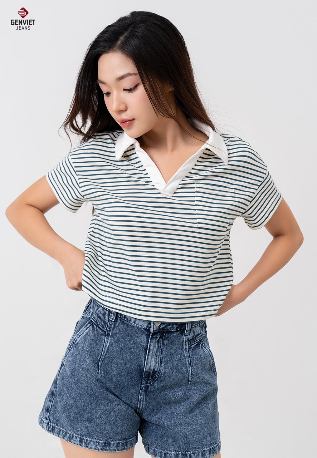 + Kiểu dáng croptop, cổ không chân mở V, dài ngang cạp quần.