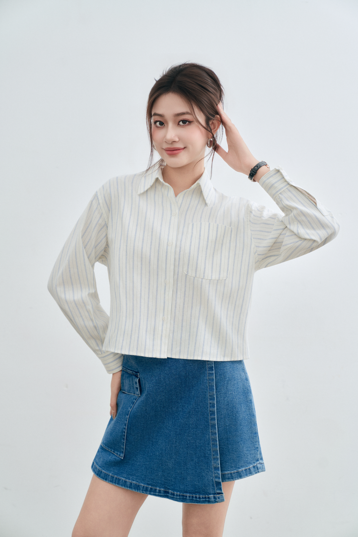 Thiết kế cổ đức hiện đại, thanh lịch. Túi ngực bên trái tạo điểm nhấn nhẹ nhàng. Họa tiết kẻ sọc trẻ trung giúp outfit trông năng động hơn, dễ ứng dụng trong nhiều phong cách.