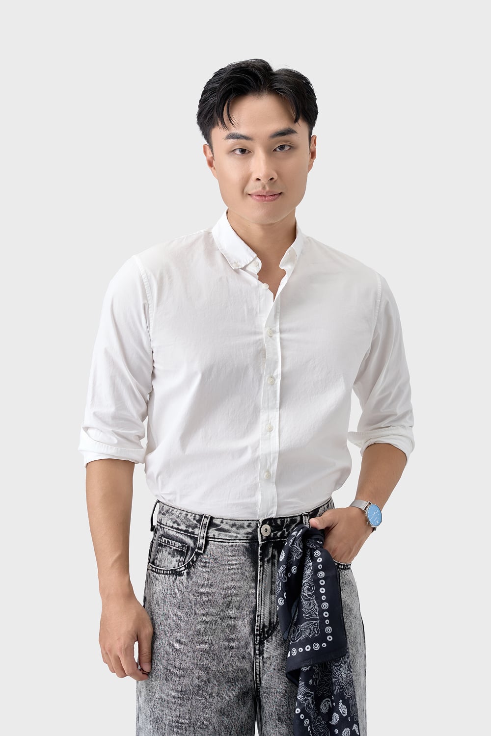 Sơ mi trắng + quần tây / jeans đứng form + giày da hoặc loafer → Lịch sự, gọn gàng, phù hợp đi làm hằng ngày.