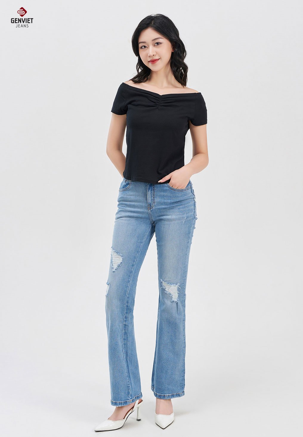 - Người mẫu: Cao 1m65 nặng 45 kg, quần size 26, áo size S