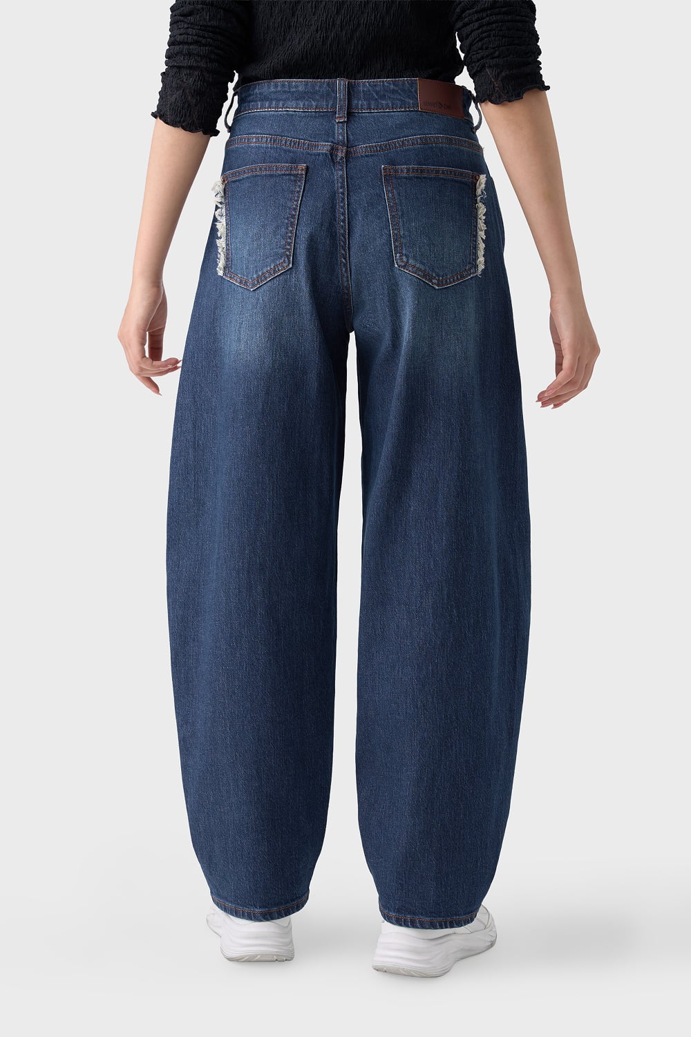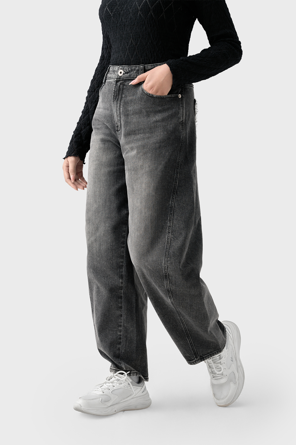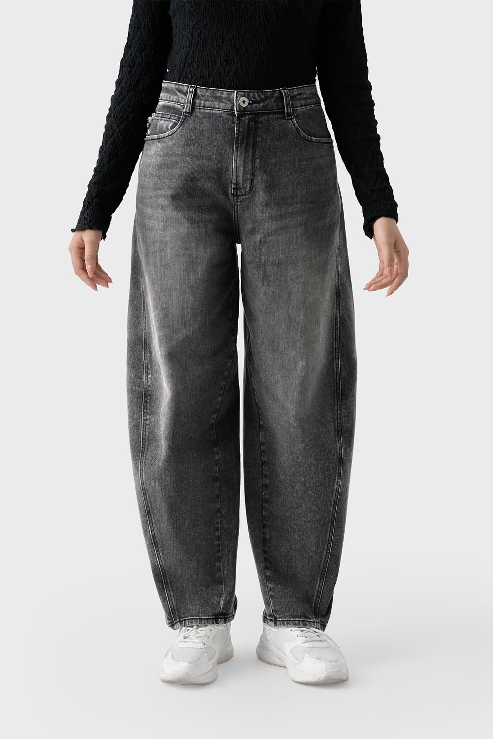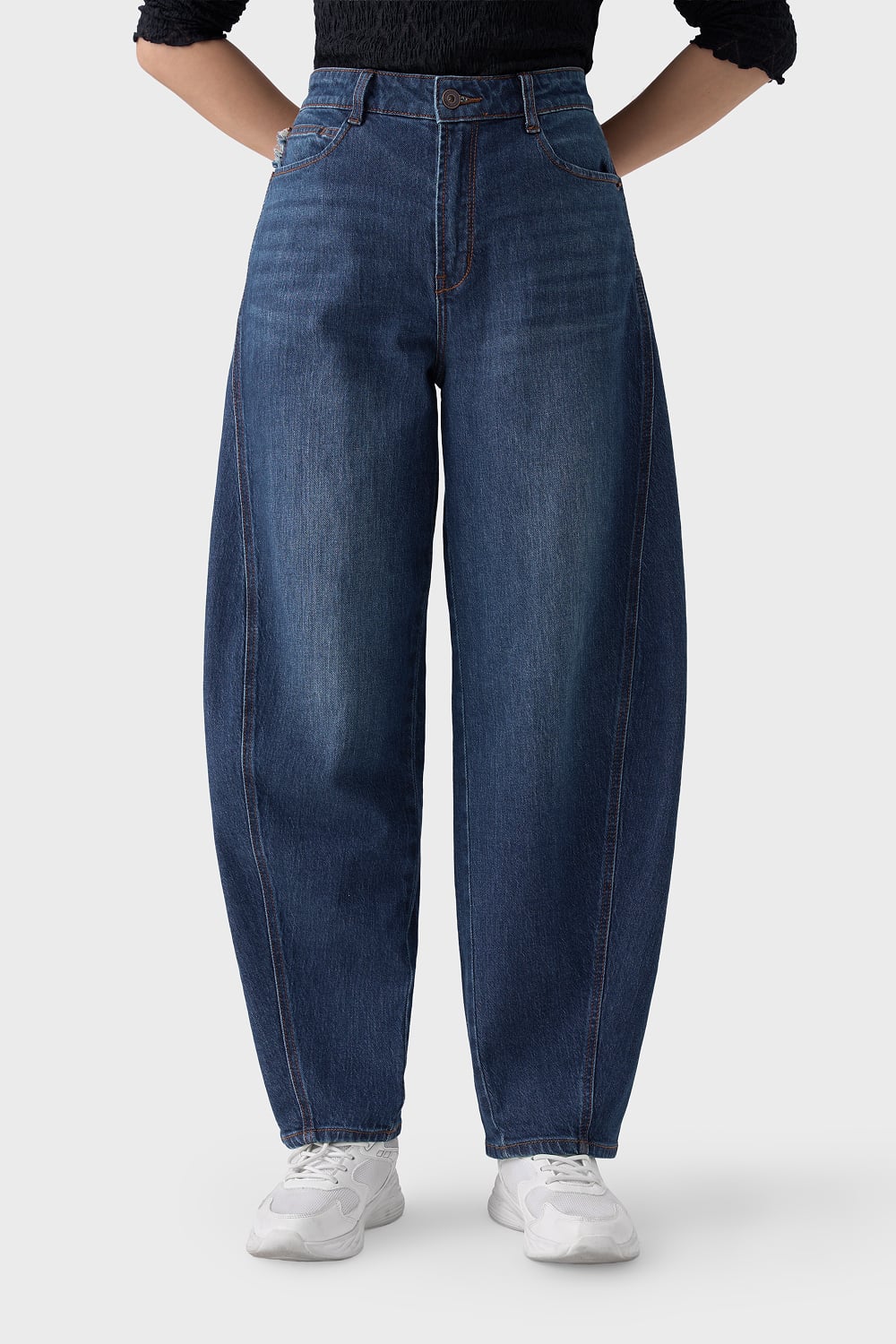 Thiết kế "lai" hoàn hảo, sự kết hợp giữa sự thoải mái của dáng Baggy và phom dáng kiến trúc của Barrel Leg (ống cong/ống thùng). Đường cắt cúp (seam) chạy dọc thân trước giúp định hình phom quần phồng nhẹ ở gối và thu gọn dần về gấu, tạo hiệu ứng chân dài và thon gọn.