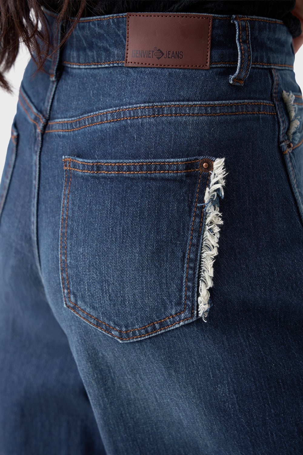Chất liệu: 99% cotton, 1% spandex. Denim dày dặn nhưng mềm mại, đứng phom.