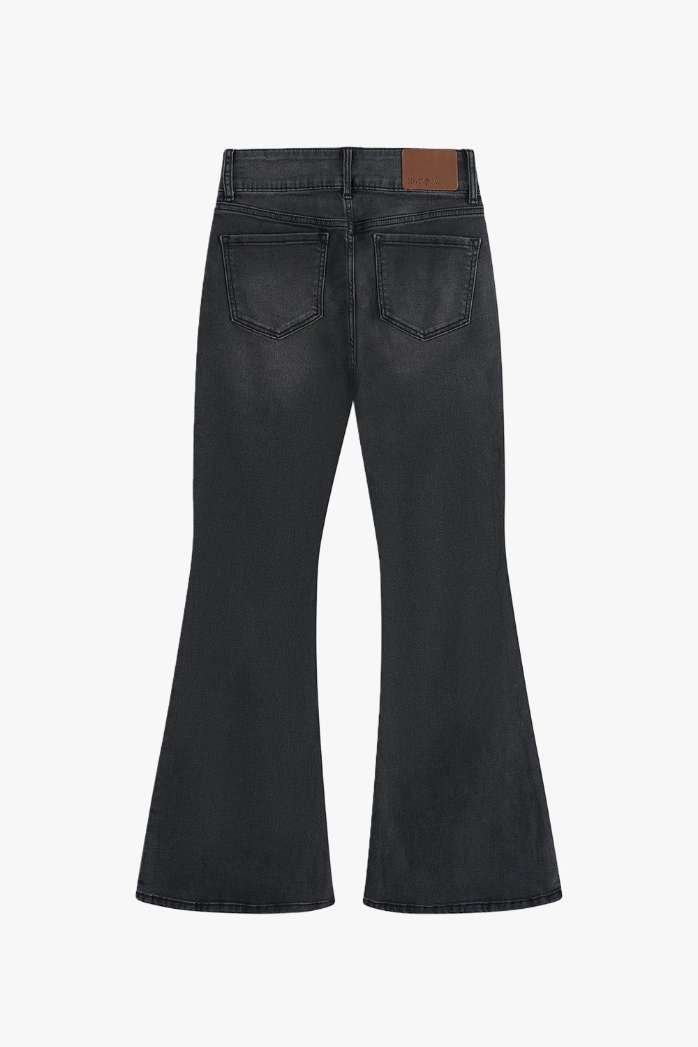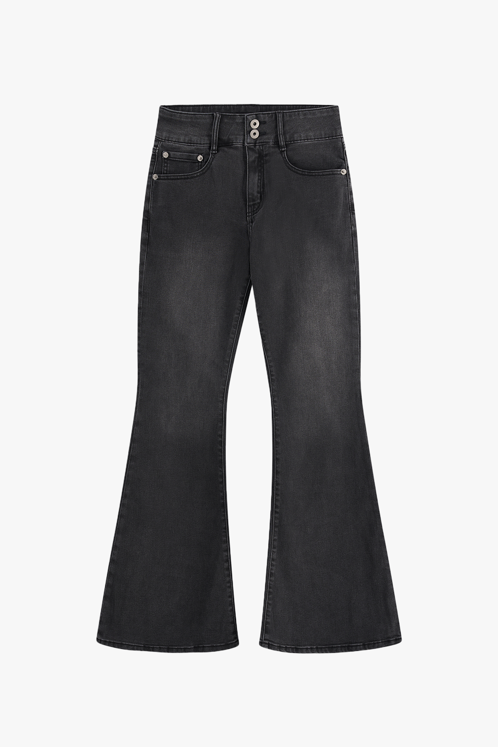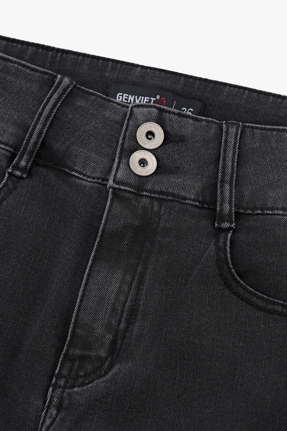 Mẫu quần mang cảm giác mặc chắc dáng, gọn gàng nhờ chất denim dày vừa nhưng vẫn có độ co giãn, không gây cứng hay khó chịu. Phần hông và đùi trên ôm vừa cơ thể, từ đầu gối ống quần loe nhẹ giúp cân bằng tỷ lệ vóc dáng và tạo hiệu ứng đôi chân dài, thon hơn. Thiết kế cạp cao hai cúc giúp ôm trọn vòng eo, tôn vòng 2 rõ rệt, mang lại vẻ ngoài chỉn chu nhưng vẫn thời trang.