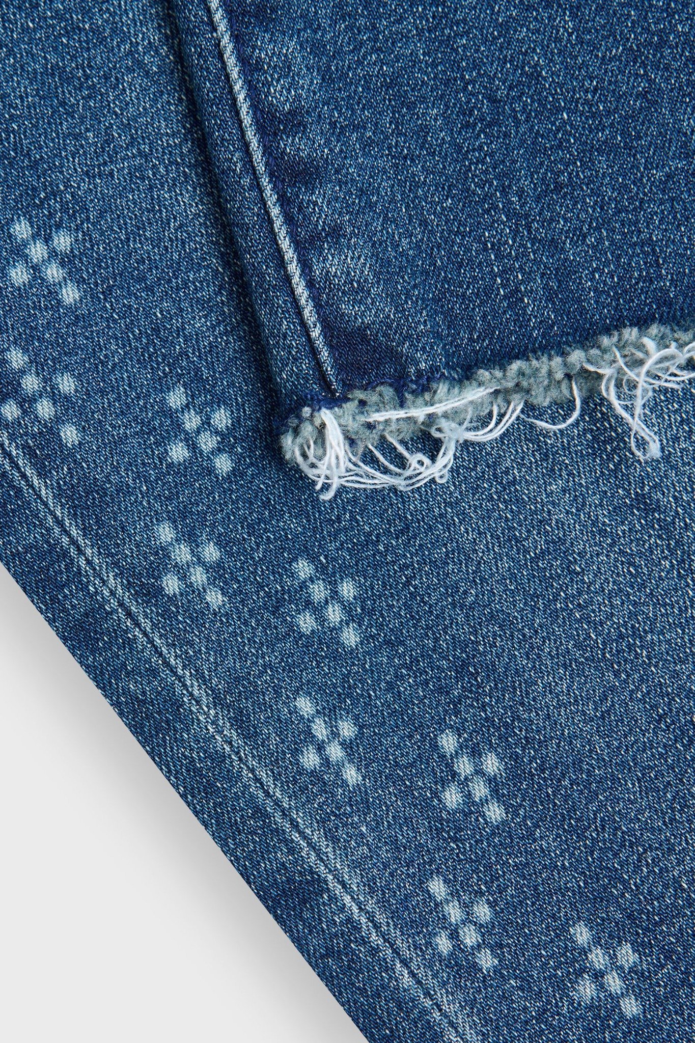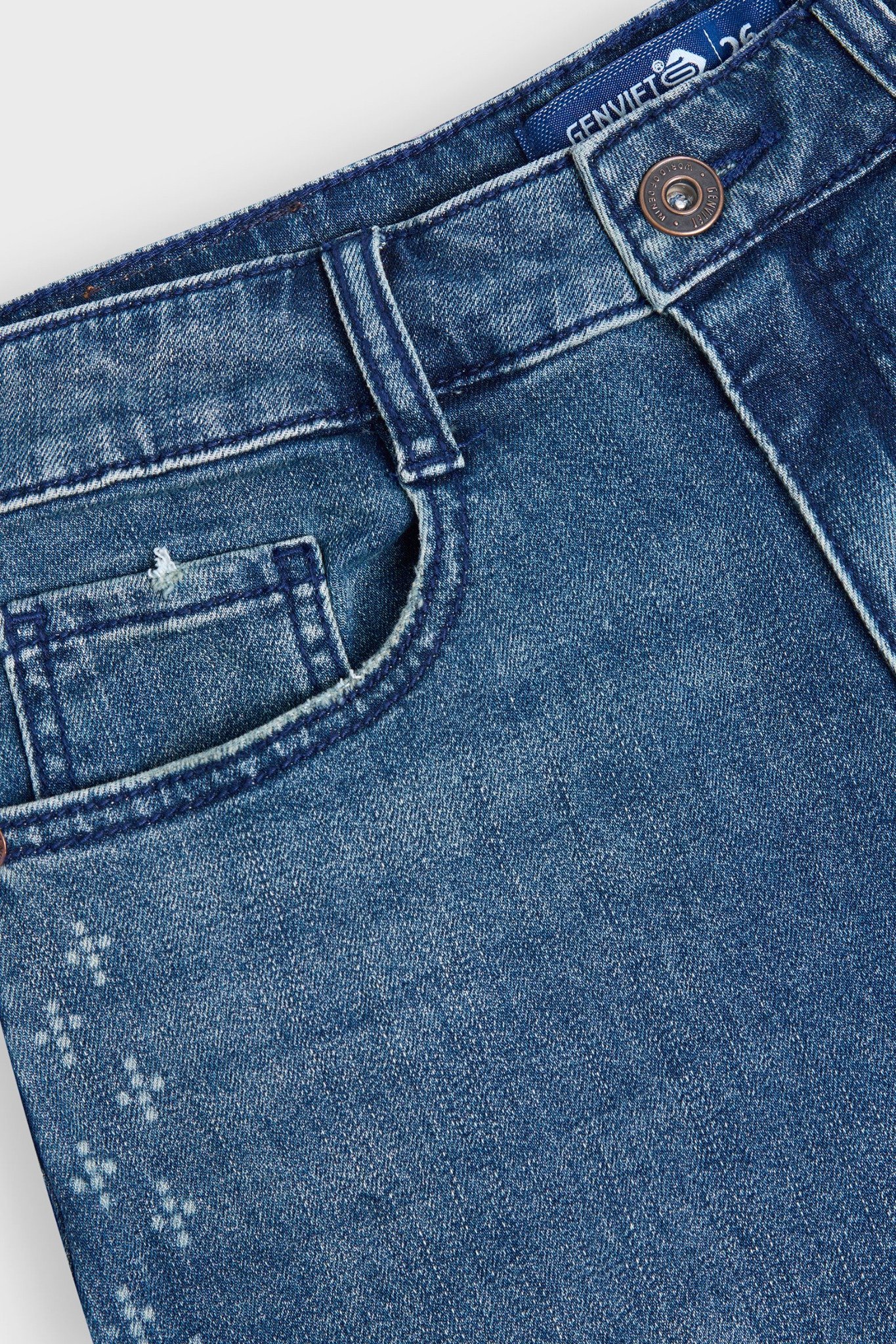 Điểm nhấn nổi bật nằm ở hiệu ứng laser xước dọc sườn độc đáo cùng gấu xõa cá tính, tạo nên phong cách trẻ trung và năng động. Bề mặt quần được xử lý giặt mài kết hợp hiệu ứng râu mèo (Whisker) và chi tiết sờn rách nhẹ giúp trang phục thêm phần bụi bặm, hợp xu hướng streetwear.
