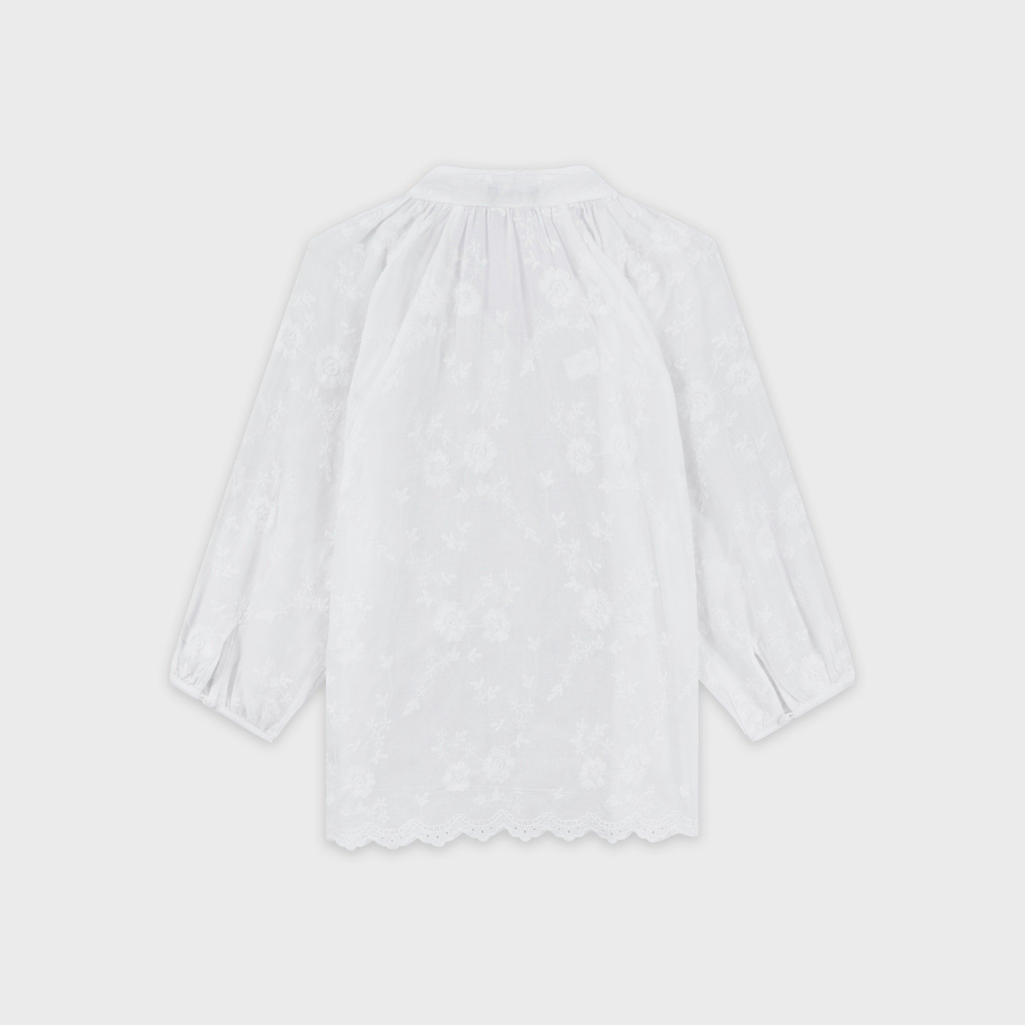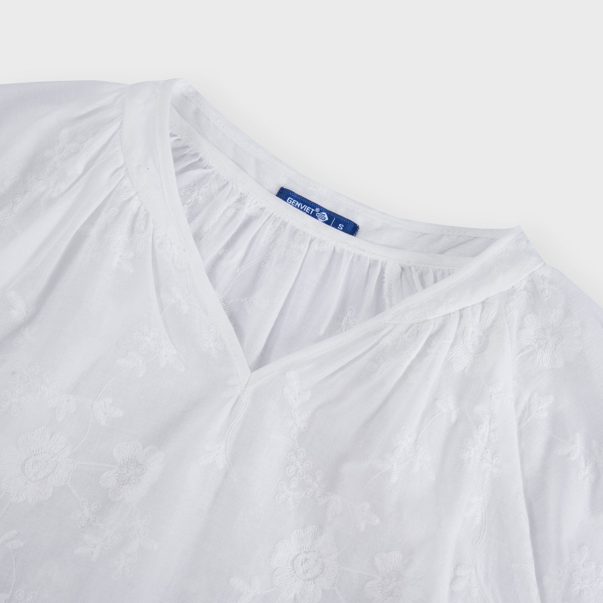 Điểm nhấn tinh tế với họa tiết ren chạy dọc và viền áo bo tròn nhẹ nhàng, tạo sự mềm mại, nữ tính nhưng vẫn hiện đại.